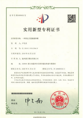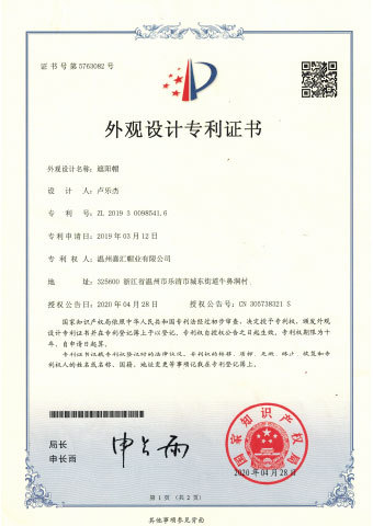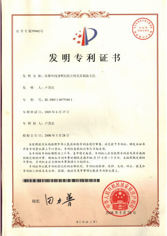 Компания имеет национальные патенты на изобретения для линз с УФ-защитой и функциональных солнцезащитных шляп с УФ-защитой, а также множество патентов на полезные модели и патенты на образцы. У нас также есть авторизованные патенты в Гонконге, Тайване и Японии.